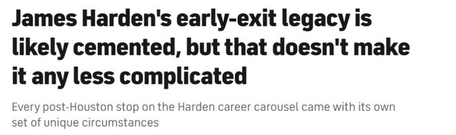 這一次的目的地是克利夫蘭——在快船的征程未能如願後,在與費城不歡而散後,在佈魯克林短暫停留後。頻繁改換門庭、季後賽早早出局,這些都將成為哈登職業生涯履歷中無法抹去的印記。單從紙面來看,他離開火箭後的這段生涯軌跡,確實難逃外界的詬病。