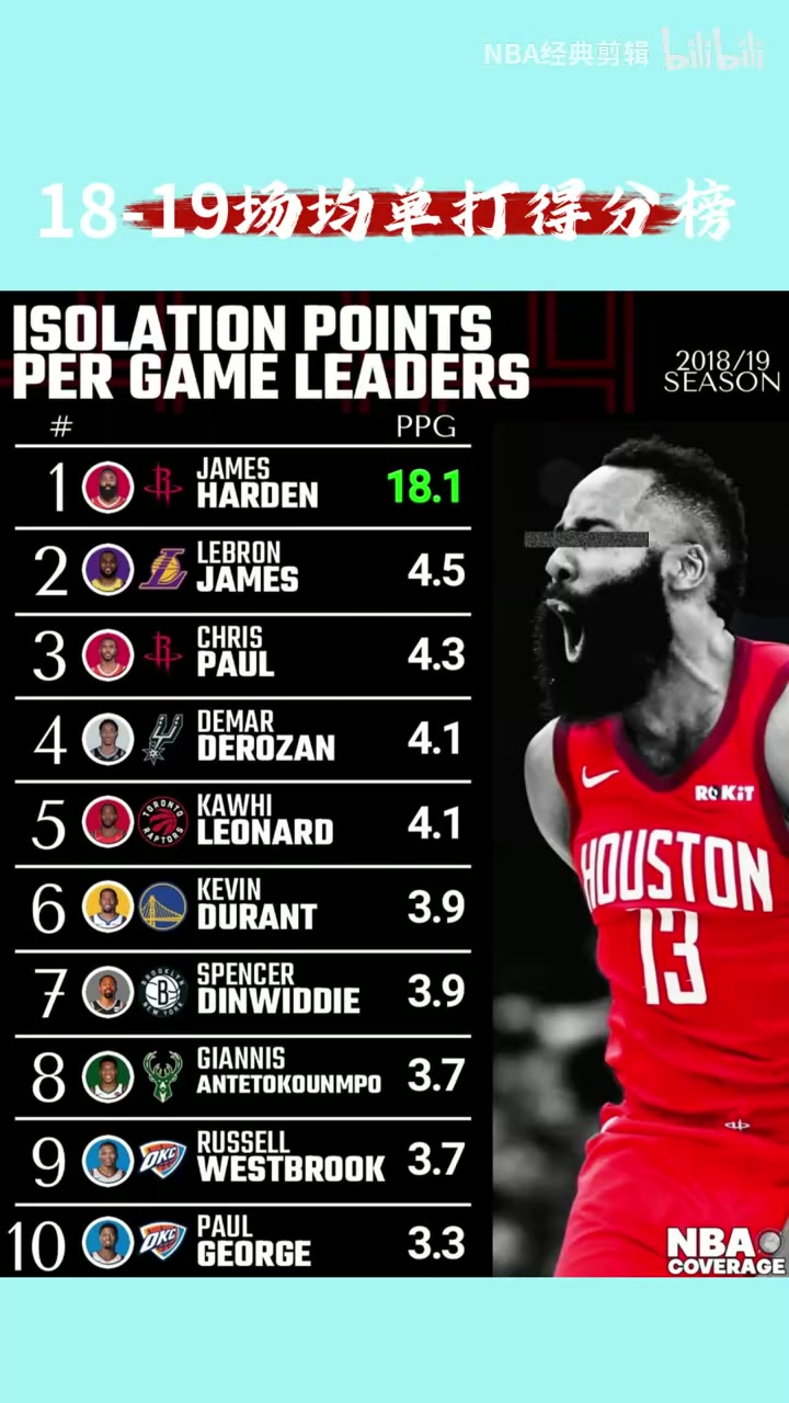 一张图足以证明含金量18/19赛季单打得分排名火箭登断档领先