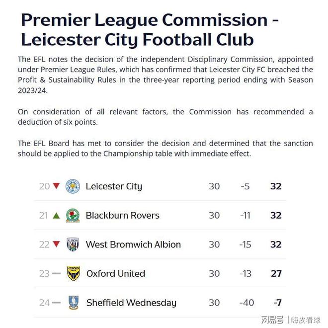 英格蘭足球聯賽(EFL)剛剛發佈消息,表示註意到獨立紀律委員會的決定,這是根據英超聯賽規則而任命的,確認瞭萊斯特城因為在過去三個賽季裡,違反瞭盈利和可持續(PSR)的規則。因此,立刻扣除萊斯特城6個積分,並且從實時的積分榜中反映出來。