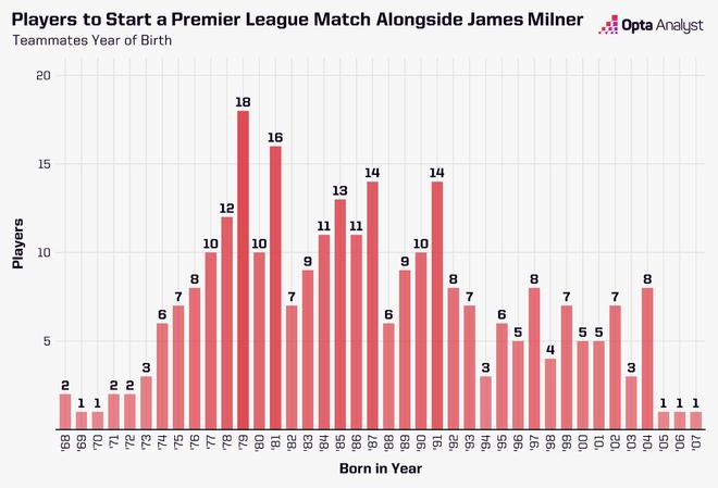 米爾納在英超聯賽中擁有281名不同的隊友,曾與出生於1968年至2007年每年的球員並肩作戰。