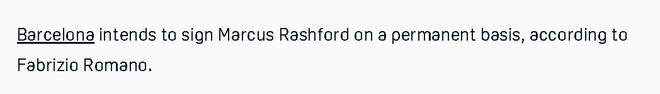 意大利轉會專傢法佈裡濟奧·羅馬諾證實,巴薩已經向拉什福德及其經紀人承諾,會全力完成轉會。「巴薩的意圖是買斷拉什福德。」羅馬諾告訴「DAZN」說,「最近幾周,他們已經把這個消息告訴瞭拉什福德和他的經紀人,所以巴薩會竭盡全力(do everything they can do)。」