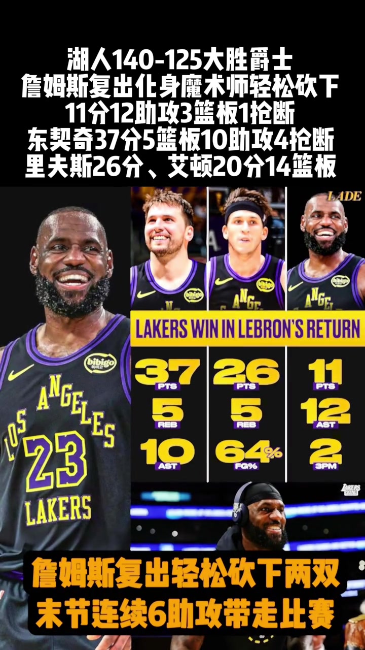 詹姆斯复出11分12助攻湖人140比125战胜爵士...